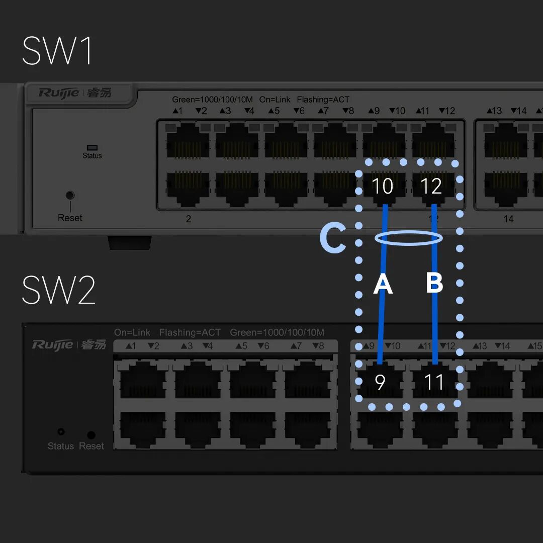 以太网中我们将点(端口)到点(端口)的这一物理连接视为一条链路。如图,假设你想对SW1的10、12端口和SW2的9、11端口做端口聚合,相当于什么?相当于对A和B链路做了链路聚合,一个东西,每个人的习惯叫法不一样罢了。
