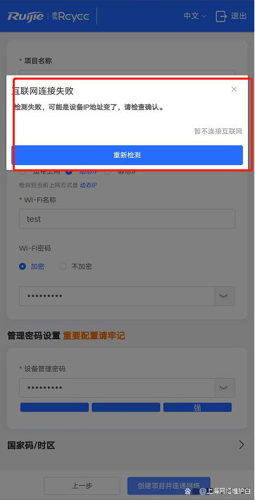 ①项目名称:自定义 ②上网方式:EG会自动检测上网方式;若检测到是静态IP,输入运营商提供的IP地址、子网掩码等信息;若检测到是宽带上网,输入运营商提供的PPPOE宽带账号和密码。 ③Wi-Fi名称和密码:内网散发的无线名称和密码 ④设备管理密码:为EG的WEB界面登录密码,请牢记!