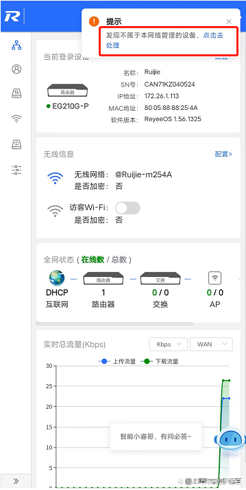 6、连接Wi-Fi后,打开手机浏览器输入192.168.110.1,即可进入EG的WEB管理界面。设备将会自动检测网络中的设备,【点击去处理】即可查看到与EG相连的其他设备。