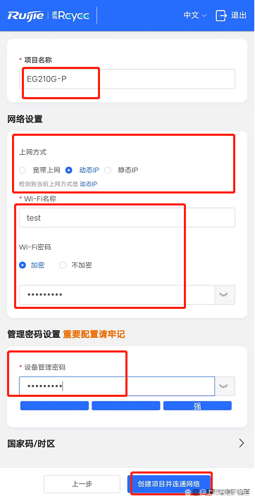 3、设置设备的上网方式、Wi-Fi名称和密码、设备登录密码等,点击【创建项目并连通网络】。