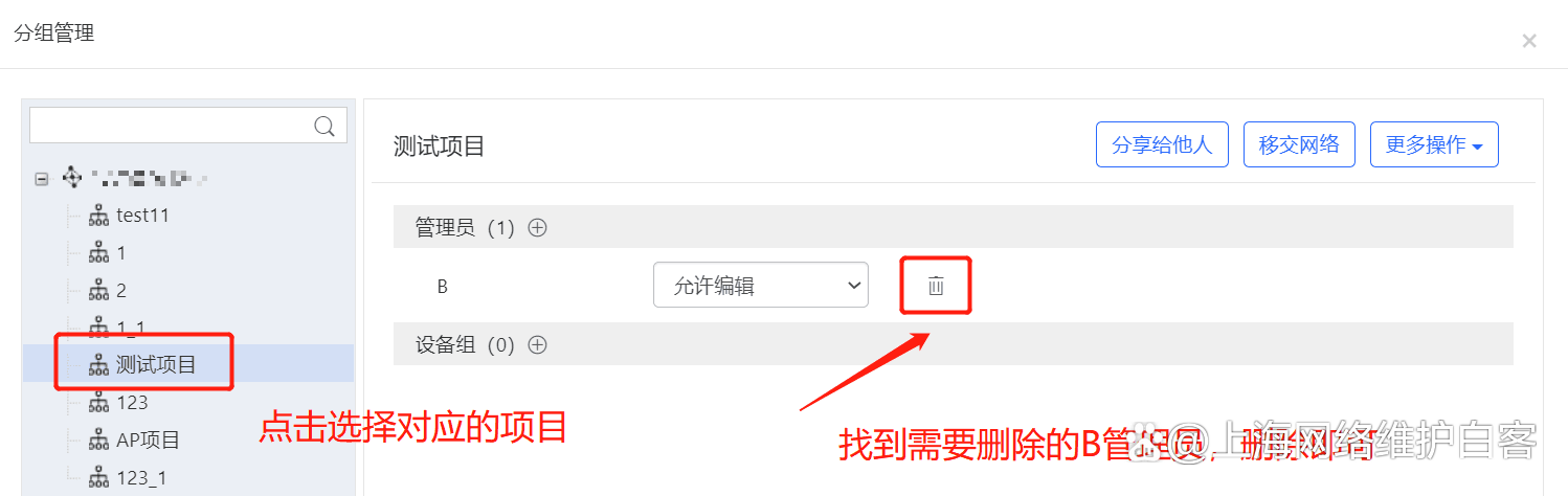 账号A将项目名称为“测试项目”分享给账号B,账号A现在想取消分享“测试项目”给账号B;(账号B想删除账号A分享的“测试项目”)。