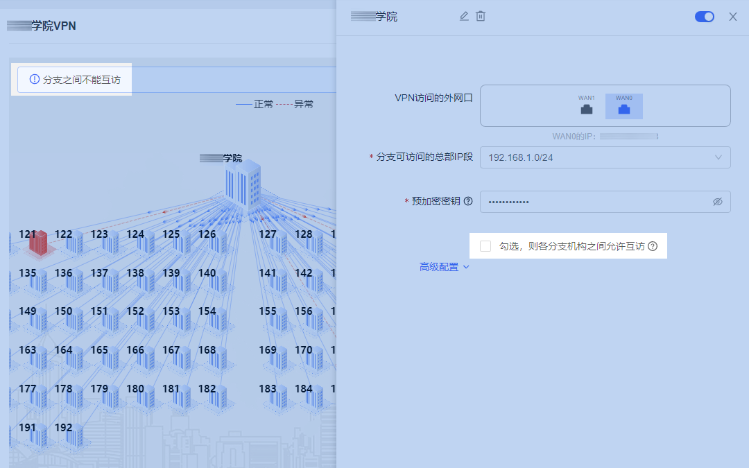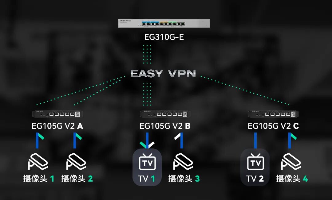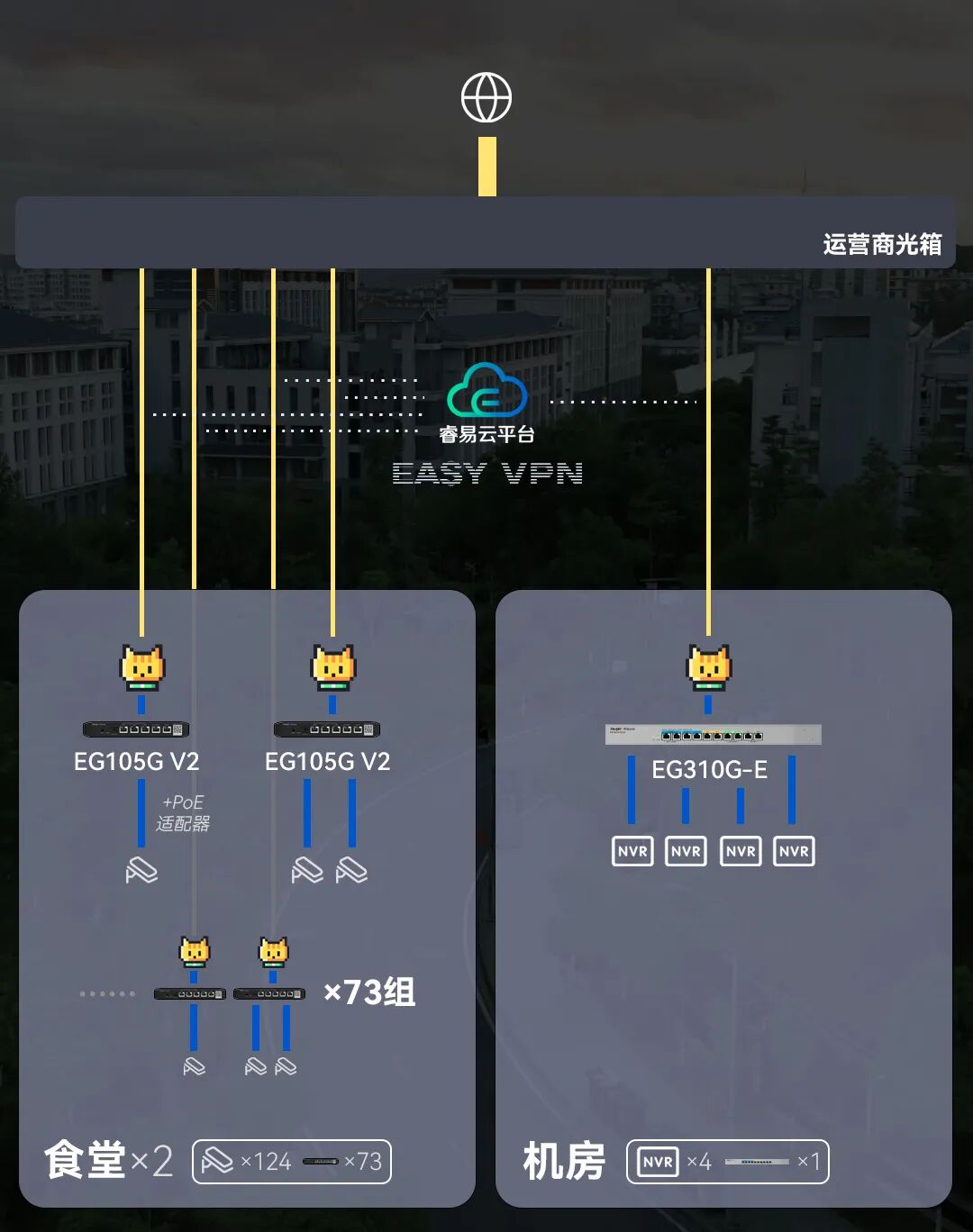 项目较特别,属于响应当地“明厨亮灶”工程*,在原有大规模校园监控基础之上的增建项目,因不便布线和其他原因,工程方和院方协商,采用了VPN回传方案,也是不得已而为之。*明厨亮灶要求,学院食堂后厨区域需要做到公开透明,同时,数据要有途径让市场监督管理局获取到VPN?传监控?思路不难理解:机房看作总公司,每个食堂监控点看作是分公司。这么一来不就实现回传了嘛。设备和规模方面。学院东西区各一个双层食堂,400万像素摄像头合计124个;机房出口一台EG310G-E网关,上联一条500M专线宽带,下联4台NVR;食堂每个弱电箱接入一条100M普通宽带,放EG105G V2网关,下联1-2个摄像头,合计73条宽带73台EG105G V2。