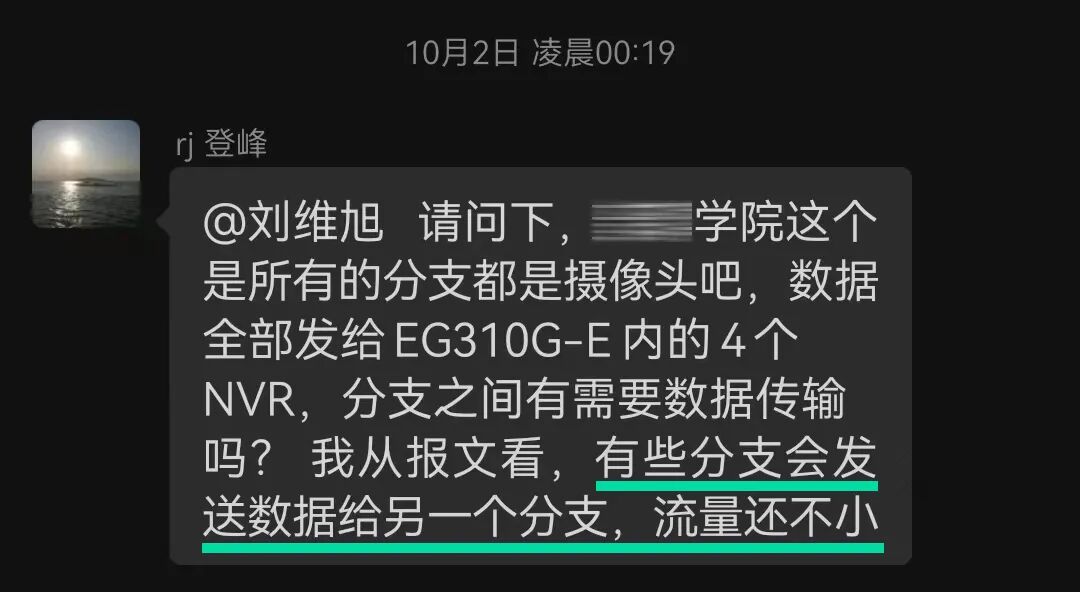 E 问题1:一条500Mbps VPN和一条500Mbps宽带有瓶颈,监控画面出现黑屏和明显卡顿124个400万像素摄像头实时回传,不考虑突发流量,按照每个头6-8Mbps码流计算,至少也要有992Mbps的VPN总带宽和出口带宽。而EG310G-E可提供的Easy VPN带宽为500Mbps,出口一条500Mbps宽带,全部存在瓶颈,不卡才怪。通过监测,EG105G V2下挂1个头的流量在6-8Mbps,2个头的到了12Mbps以上,平均单个头预估6-8Mbps,124个头总流量确实要奔着1000Mbps去了。但实际上,这个流量有蹊跷,不会到这么多,我们马上会讲到。 E 问题2:Easy VPN只跑到300Mbps?其次,我们发现,本能跑到500Mbps的Easy VPN通道只有300Mbps上下,而且非常平稳,这就奇怪了。一样有待处理。最后一个问题也有意思——Easy VPN通道上出现了一位“不速之客”。就是下图中的电视,2个双层食堂每层用餐区架2台,合计8台,每台显示4画面,用来向就餐师生和职工公示。这位不速之客超出了预设:食堂的分机EG105G V2只负责将1-2个监控数据上传云端,机房的总机EG310G-E只负责将监控数据从云端接下来吐给NVR。如下图,注意所有绿色标记,TV 1若要显示摄像头1、2、3、4四画面,除去摄像头3可以本地显示不占用VPN带宽以外,剩下3条绿色的数据流就是额外多出的流量,我们检查这波流量合计高达100+Mbps,它们就像小偷,给原本局促的VPN通道雪上加了个霜。所以这里也有空间。